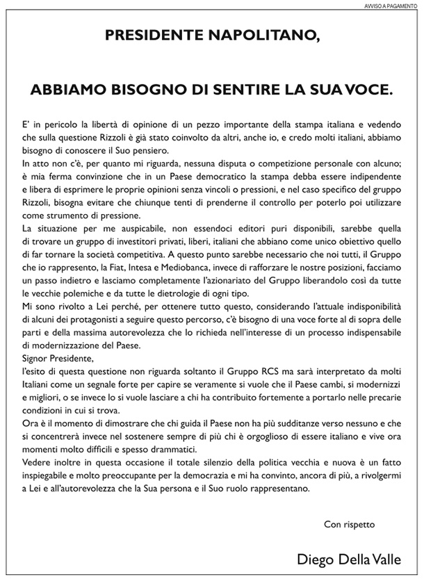 Martedì 9 luglio Diego Della Valle ha pubblicato su Repubblica una lettera, tra gli annunci a pagamento, indirizzata al presidente della Repubblica, Giorgio Napolitano. Della Valle chiede a Napolitano di esprimere “il suo pensiero” sul piano di acquisizioni di quote annunciato da FIAT per diventare il primo azionista del Gruppo RCS, che tra le altre cose controlla il Corriere della Sera, e propone che tutti i vecchi principali azionisti escano dalla società. La scorsa settimana, Della Valle aveva invece detto di essere pronto a sottoscrivere l’aumento di capitale, fino al superamento della quota di FIAT.