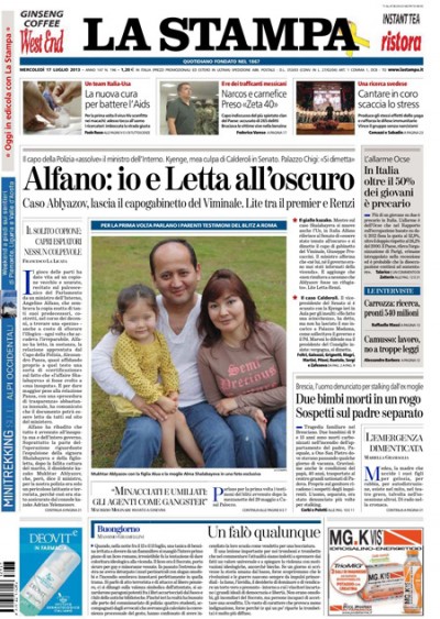 I giornali di oggi aprono tutti con le dichiarazioni alle Camere sul caso Shalabayeva del ministro dell’interno Alfano, che si è difeso dicendo di non essere stato informato dell’operazione, e con le dimissioni per la vicenda del capo di gabinetto del ministero Procaccini, che però secondo il Corriere della Sera avrebbe informato il ministro del suo incontro con l’ambasciatore kazako. Libero invece critica l’attenzione eccessiva al caso Shalabayeva e vorrebbe maggiore attenzione ai dati economici, mentre il Giornale titola sul “piano” di Renzi per far cadere il governo Letta.