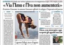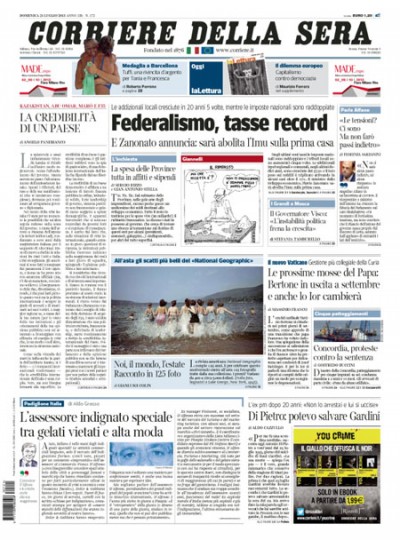 I giornali di oggi scelgono titoli principali diversi: Repubblica parla del possibile rimpasto di governo che potrebbe accadere a settembre, mentre il Corriere si occupa dell’aumento della pressione fiscale negli ultimi anni. Molte prime pagine riprendono l’annuncio del ministro dello sviluppo economico Zanonato, che ieri ha detto che a settembre non ci sarà né l’aumento dell’IVA né l’IMU sulla prima casa. Diversi quotidiani citano anche la medaglia d’argento vinta ieri dalle tuffatrici Cagnotto e Dallapé ai mondiali di nuoto di Barcellona.