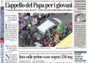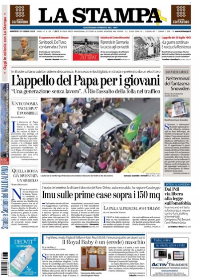 I giornali di oggi aprono con notizie diverse: la Stampa, Avvenire e il Secolo XIX si occupano dell’arrivo di Papa Francesco in Brasile per le giornate della gioventù, con la sua auto bloccata nel traffico e circondata dalla folla, il Corriere della Sera e l’Unità seguono ancora il caso Shalabayeva, che secondo il Corriere potrebbe tornare in Italia, Repubblica e Europa aprono sulla legge sull’omofobia, che il PDL vorrebbe rinviare mentre il PD insiste sulla sua approvazione, il Messaggero e Libero rimangono sulle ipotesi di modifica dell’IMU, e il Fatto si occupa delle sofferenze bancarie.