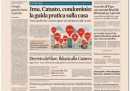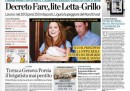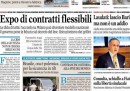 L’apertura dei giornali di oggi è dedicata a notizie diverse: la Stampa e il Corriere della Sera aprono sulla firma da parte dei sindacati confederali di un accordo con la società Expo 2015 per una maggiore flessibilità nei rapporti di lavoro, il Messaggero e l’Unità si occupano della Fiat, che dopo la sentenza della Consulta che ha dichiarato illegittima l’esclusione della FIOM è incerta sul suo futuro in Italia, Repubblica titola sulla legge sul voto di scambio, a cui si oppongono i pubblici ministeri, il Secolo XIX e Manifesto seguono invece le polemiche fra governo e Movimento 5 Stelle sulla decisione di porre la fiducia sul “decreto del fare”, Avvenire apre con l’inizio delle giornate della gioventù in Brasile, e il Giornale inizia il conto alla rovescia per la sentenza della cassazione su Berlusconi. I quotidiani sportivi aprono con un nuovo caso di razzismo, con i cori contro il giocatore del Milan Constant durante un’amichevole a Sassuolo.