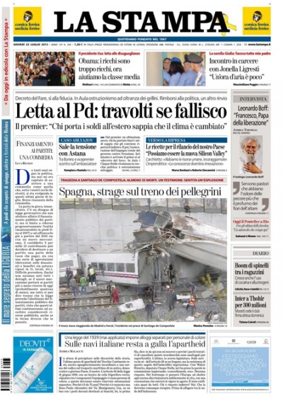 La fiducia sul "decreto del fare", Letta contro gli evasori, e l'incidente ferroviario in Spagna