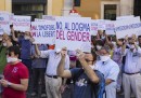Oggi, venerdì 26 luglio, l’associazione “UominiDonneBambini” ha organizzato un flash mob davanti alla Camera per contestare la legge contro l’omofobia, che lunedì 22 luglio è stata approvata dalla commissione Giustizia e di cui è cominciata oggi la discussione in aula. «Siamo contro la violenza e siamo a favore della libertà di espressione. Non vogliamo andare in galera se diciamo apertamente che un figlio deve avere un padre e una madre», ha detto uno dei partecipanti alla manifestazione, che si sono presentati davanti alla Camera imbavagliati e hanno mostrato diversi striscioni di critica alla legge. UominiDonneBambini è un movimento che raduna persone che ritengono che «la persona e la famiglia sono il punto di partenza dei diritti» e che siano valori che al giorno d’oggi vengono «messi in discussione con strumenti lesivi della libertà di espressione e di pensiero».