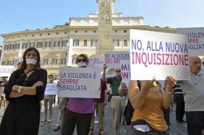 Oggi, venerdì 26 luglio, l’associazione “UominiDonneBambini” ha organizzato un flash mob davanti alla Camera per contestare la legge contro l’omofobia, che lunedì 22 luglio è stata approvata dalla commissione Giustizia e di cui è cominciata oggi la discussione in aula. «Siamo contro la violenza e siamo a favore della libertà di espressione. Non vogliamo andare in galera se diciamo apertamente che un figlio deve avere un padre e una madre», ha detto uno dei partecipanti alla manifestazione, che si sono presentati davanti alla Camera imbavagliati e hanno mostrato diversi striscioni di critica alla legge. UominiDonneBambini è un movimento che raduna persone che ritengono che «la persona e la famiglia sono il punto di partenza dei diritti» e che siano valori che al giorno d’oggi vengono «messi in discussione con strumenti lesivi della libertà di espressione e di pensiero».