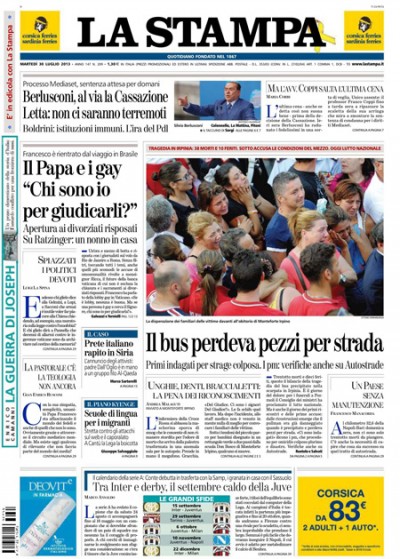 La maggior parte dei giornali di oggi titola ancora sull’incidente al pullman in Irpinia, che ha provocato 38 morti tra i passeggeri, e ne analizza le possibili cause: secondo le prime ricostruzioni sembra che il pullman stesse perdendo pezzi già prima dell’incidente. Libero, Europa, il Fatto, il Tempo e il Giornale aprono invece sull’attesa per la sentenza della Cassazione per Berlusconi, mentre Avvenire e l’Osservatore Romano si soffermano sulla chiusura delle Giornate della gioventù in Brasile, e su molte prime pagine vengono riportate le parole di Papa Francesco sui gay. I quotidiani sportivi aprono con il sorteggio del calendario del prossimo campionato di calcio, con la partenza difficile per la Juventus.