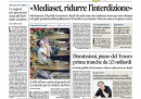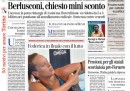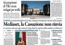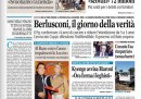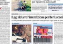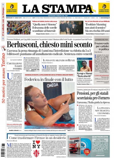 Per quasi tutti i giornali di oggi l’apertura è dedicata all’udienza del processo Mediaset in Cassazione, durante la quale ieri il procuratore generale ha chiesto la conferma della condanna per Berlusconi con la riduzione dell’interdizione da 5 a 3 anni. Avvenire e il Mattino si occupano invece del funerale a Pozzuoli per le vittime del pullman precipitato dal viadotto in autostrada e delle indagini sull’incidente. I quotidiani sportivi titolano sulla qualificazione con il miglior tempo di Federica Pellegrini alla finale dei 200 stile libero ai mondiali di Barcellona.
