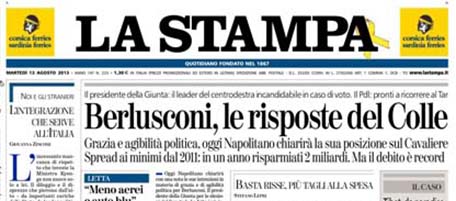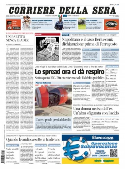 Dopo una giornata non particolarmente ricca di notizie, i quotidiani italiani prendono strade diverse. La cosa più in vista, che apre le prime pagine di Repubblica e della Stampa (e ha un taglio alto sul Corriere), deve ancora accadere: si attende una nota di Napolitano su Berlusconi. Il Corriere però dedica il suo titolo principale ai dati dello spread in miglioramento. Un altro fatto di cui si parla molto è l’aggressione con acido sul viso contro una donna ieri a Genova.