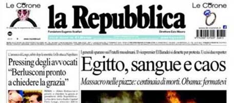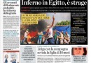 I giornali di oggi si dividono tra due temi, per i titoli di apertura: il massacro in Egitto, naturalmente, ma anche di nuovo la questione dell’eventuale richiesta di grazia di Berlusconi, nonostante ieri non ci siano stati sviluppi rilevanti in questo senso. I giornali locali aprono quasi tutti sulla cronaca, trova parecchio spazio anche la notizia della stima secondo cui l’eurozona globalmente è uscita dalla recessione.