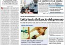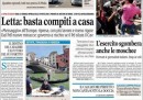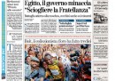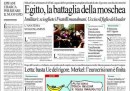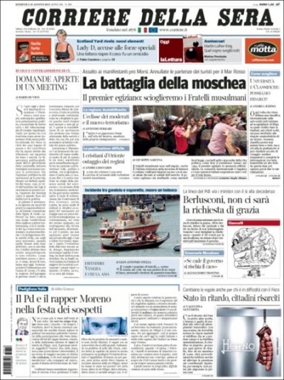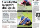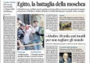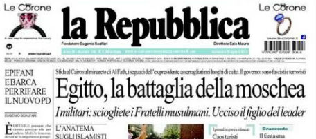 I maggiori quotidiani dedicano il titolo principale alla “battaglia della moschea” in Egitto, riferendosi all’assedio della moschea di Al Fateh, al Cairo, che è stato al centro degli eventi di ieri nel paese. C’è però anche la politica: qualcuno dedica un titolo alla questione della grazia a Berlusconi, qualcun altro a una dichiarazione di Letta contro il “rigore” nelle politiche europee. Molti quotidiani, non solo quelli sportivi, mettono in prima pagina anche la vittoria di Usain Bolt nei 200 metri ai mondiali di atletica di Mosca.