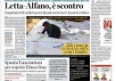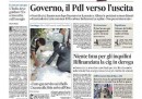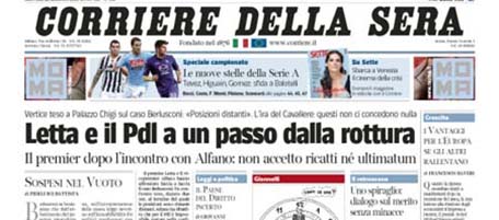 I giornali di oggi descrivono il governo “in bilico”, dicono che “vacilla”, e parlano di “tensione”, “scontro frontale”, “rottura”, “scontro”, “braccio di ferro”. Secondo il Messaggero il PdL è “verso l’uscita” dal governo. Il titolo del Centro è il più sarcastico: “Solite minacce di crisi”.