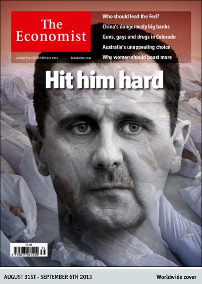 Il settimanale inglese The Economist ha diffuso la copertina del prossimo numero, che uscirà venerdì. In primo piano si vede, in trasparenza, il volto del presidente della Siria Bashar al Assad, che ha sullo sfondo una delle note immagini dei cadaveri dei bambini siriani morti in seguito al presunto bombardamento chimico del 21 agosto. Il titolo inglese, Hit him hard, è traducibile in italiano come “Colpitelo duro”.