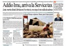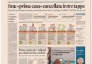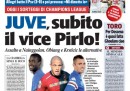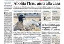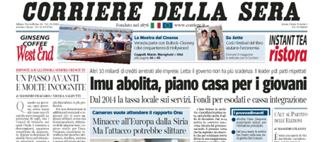 I giornali di oggi aprono tutti con la decisione del consiglio dei ministri di ieri di abolire l’IMU sulla prima casa e di sostituirla dal 2014 con la service tax. Altre notizie presenti su tutte le prime pagine sono la situazione in Siria, con le divisioni fra i paesi occidentali sull’attacco e sull’attesa di un pronunciamento dell’ONU, e la richiesta di Berlusconi alla giunta che deve decidere sulla sua decadenza da senatore di attendere la pronuncia della Corte Costituzionale sulla legge Severino. I quotidiani sportivi aprono con la vittoria sul PSV del Milan, che si qualifica così alla Champions League, e sulla minaccia, forse scherzosa, di dimissioni da parte dell’allenatore Allegri.