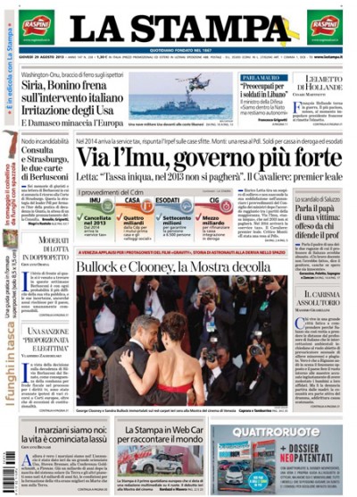 Il governo abolisce l'IMU, l'attesa per l'attacco alla Siria, e l'avvio del Festival di Venezia