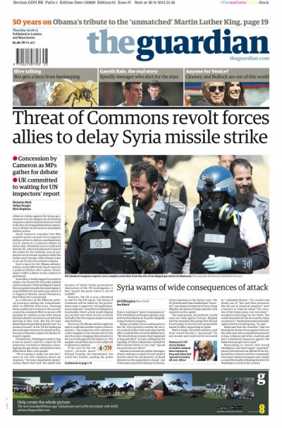 Prima del cambiamento di programmi di Cameron, il ministro degli Esteri William Hague aveva detto che la sicurezza nazionale del Regno Unito sarebbe stata in pericolo, in assenza di un intervento contro la Siria e il suo utilizzo di armi chimiche. Aveva anche detto che non si poteva consentire alla “paralisi diplomatica di fare da scudo agli autori di simili crimini”. In seguito alle posizioni assunte da alcuni membri della maggioranza e dai laburisti, e ai sondaggi sull’opinione pubblica britannica poco favorevole a un intervento, Hague ha cambiato sensibilmente tono, ricordando che la mozione in discussione in Parlamento “riflette il riconoscimento da parte del primo ministro delle profonde preoccupazioni in questo paese su ciò che avvenne in Iraq”.
