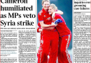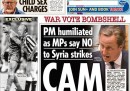 Il voto parlamentare che nella tarda serata di giovedì ha sorprendentemente battuto il governo britannico di David Cameron sull’intervento in Siria – bocciato, con immediato annuncio di rinuncia da parte di Cameron – ha spiazzato i quotidiani inglesi che a quell’ora avevano già preparato le prime pagine, e sono stati costretti a ridisegnarle. Le nuove prime pagine danno naturalmente molto spazio alla sconfitta di Cameron, rispetto alle precedenti versioni.