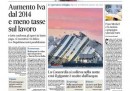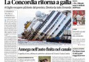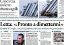 Non c’è un’apertura unica sui giornali di oggi: l’operazione di raddrizzamento della Costa Concordia all’isola del Giglio è su tutte le prime pagine, ma molti aprono ancora con l’attesa per il primo voto della giunta del Senato sulla decadenza di Berlusconi fissato per domani sera e sulle conseguenze per la tenuta del governo, e sulla situazione economica, con le iniziative del governo su IVA e tasse sul lavoro. Il Giornale e il Fatto annunciano un nuovo messaggio video di Berlusconi, che dovrebbe sancire la rinascita di Forza Italia, e il Manifesto segue le manifestazioni dei dipendenti del gruppo ILVA dopo lo stop alla produzione della settimana scorsa.