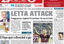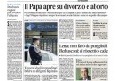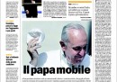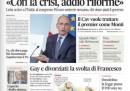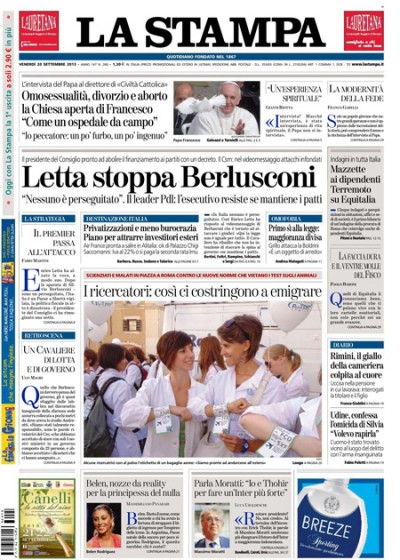 Molti giornali di oggi dedicano l’apertura alle parole di Papa Francesco, che in una lunga intervista a Civiltà Cattolica ha esposto la sua visione sul ruolo della Chiesa, che deve essere “come un ospedale da campo”, e ha espresso posizioni di apertura verso divorzio e aborto. Repubblica, la Stampa, l’Unità e Europa aprono invece sull’intervento del Presidente del Consiglio Letta, che risponde a Berlusconi negando che sia perseguitato dalla magistratura, il Giornale e la Padania seguono l’indagine per corruzione nei confronti di alcuni dipendenti di Equitalia, e i quotidiani sportivi titolano sulla cessione dell’Inter all’imprenditore indonesiano Thohir, ormai data per certa.