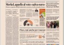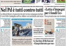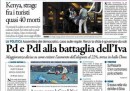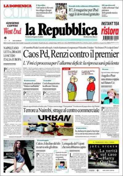 Repubblica torna oggi in edicola, dopo lo sciopero di ieri, e dedica il titolo all’assemblea nazionale del Partito Democratico, in cui ci sono stati parecchi scontri: “Caos PD”, quindi, a cui aggiunge “Renzi contro il premier” citando l’intervento del sindaco di Firenze (potete vederlo qui). Altri giornali, come La Stampa, dedicano il titolo all’attentato di ieri a Nairobi, in cui sono morte oltre trenta persone. Il Corriere ha invece un’intervista al ministro dell’Economia Saccomanni, che sarebbe “pronto a lasciare” se continueranno le pressioni sulle misure di politica economica.