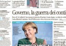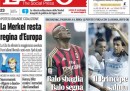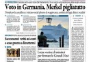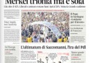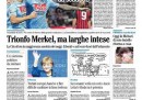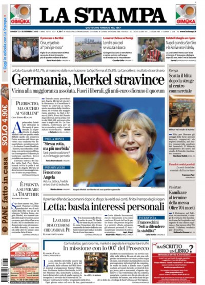 Tutti i giornali di oggi aprono con la vittoria della CDU-CSU di Angela Merkel, che è vicina ad ottenere la maggioranza assoluta dei seggi nelle elezioni in Germania. Solo il Giornale rimane sulla situazione politica italiana, prevedendo la caduta del governo Letta dopo le parole del ministro dell’economia Saccomanni che ha minacciato le dimissioni richiamando gli alleati a dire la verità sui conti. I quotidiani sportivi aprono con le vittorie del Napoli e della Roma, rispettivamente contro il Milan e nel derby romano, che rimangono in testa alla classifica a punteggio pieno.