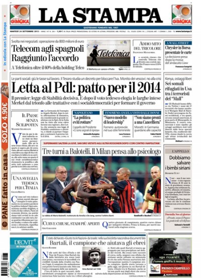 Sono due le notizie principali in apertura sui giornali di oggi: l’intervento a sostegno del governo Letta del Presidente della Repubblica Napolitano, che ha invitato i partiti a evitare rotture per non perdere i segnali di ripresa economica, e le trattative per la vendita a Telefonica della maggioranza delle azioni di Telecom, che sembrano ormai giunte a una definizione positiva. Il Manifesto titola invece sull’assalto al centro commerciale a Nairobi, mentre il Fatto si occupa ancora dei risultati delle elezioni tedesche, e il Giornale accusa lo Stato di rimborsare in ritardo i crediti sull’IVA.