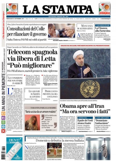 Le prime pagine di mercoledì 25 settembre 2013