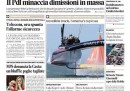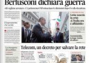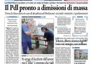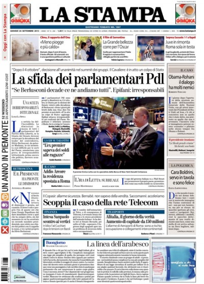 I giornali di oggi aprono quasi tutti con la minaccia dei parlamentari del PDL di dimettersi in blocco se il Senato voterà per la decadenza da senatore di Silvio Berlusconi e con la conseguente probabile crisi di governo. Avvenire si occupa invece della vendita di Telecom a Telefonica e delle preoccupazioni per il passaggio di proprietà della rete Telecom, sulla quale il governo potrebbe porre un veto, mentre il Manifesto titola sulla visita in Val di Susa del ministro dell’interno Alfano. I quotidiani sportivi aprono con i risultati della serata di campionato, che vedono la Roma rimanere da sola in testa a punteggio pieno.