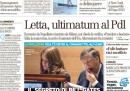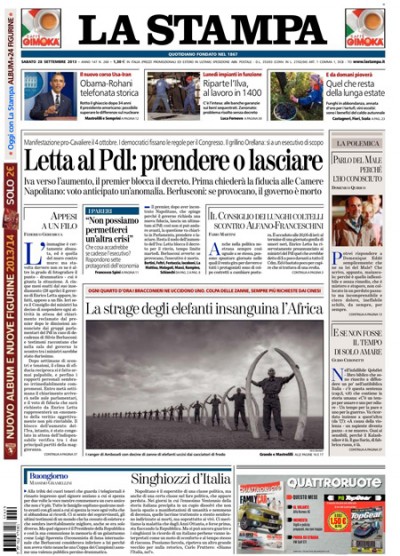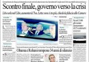 I giornali di oggi aprono tutti con la reazione del Presidente del Consiglio Letta che, dopo le minacce di dimissioni dei parlamentari del PDL, ha incontrato il Presidente della Repubblica Napolitano e nel consiglio dei ministri di ieri sera ha chiesto che il confronto si svolga in Parlamento, per ottenere un voto di fiducia e rilanciare l’attività del governo o aprire ufficialmente la crisi. Conseguenza di questo è il rinvio della decisione sull’aumento dell’IVA, che a questo punto sembra inevitabile.