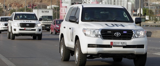 Foto: il convoglio di ispettori dell’ONU all’aeroporto di Beirut, in Libano, prima di arrivare a Damasco (AP Photo/Bilal Hussein)