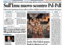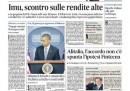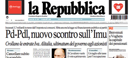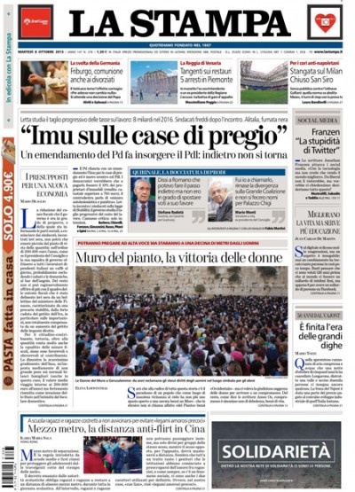Quasi tutti i giornali di oggi aprono con le nuove tensioni nel governo fra PD e PDL dopo la presentazione di un emendamento da parte del PD che prevede il ripristino dell’IMU sulle case di pregio. Avvenire, il Manifesto e l’Osservatore Romano si occupano ancora del naufragio di Lampedusa e delle ipotesi di modifica alle leggi sull’immigrazione, l’Unità titola sull’incontro tra il Presidente del Consiglio Letta e i sindacati per ridurre le tasse sul lavoro, e il Secolo XIX apre con le ipotesi di rilancio per Alitalia.