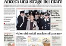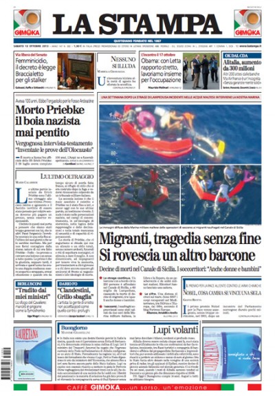 Quasi tutti i giornali di oggi aprono con il nuovo naufragio nel canale di Sicilia di un barcone con oltre 200 persone a bordo, che ha causato decine di morti. Il Giornale e Libero titolano invece sulla richiesta dei servizi sociali presentata dagli avvocati di Berlusconi e sui suoi timori di finire in carcere, il Sole 24 Ore si occupa dell’aumento di capitale di Alitalia, approvato ieri dal consiglio di amministrazione, e il Tempo apre sulla morte di Erich Priebke. I quotidiani sportivi commentano il pareggio con la Danimarca dell’Italia, già qualificata ai Mondiali in Brasile.