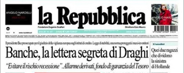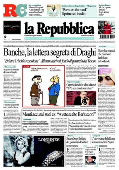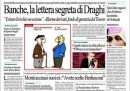 C’è un po’ di tutto sulle prima pagine dei quotidiani di oggi. Repubblica apre con una “lettera segreta” inviata dal governatore della BCE Mario Draghi alla Commissione Europea. Il Corriere della Sera sceglie di parlare ancora della legge di stabilità. Il Fatto Quotidiano, il Giornale e Libero dedicano anche oggi le loro prime pagine all’intervento di Michelle Bonev durante la puntata di Servizio Pubblico di giovedì scorso.