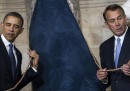 US President Barack Obama (L) and Speaker of the House John Boehner (R-OH) wait to unveil a statue of Rosa Parks during an unveiling in Statuary Hall on Capitol Hill February 27, 2013 in Washington, DC. President Barack Obama, Speaker John Boehner and others took part in the ceremony to unveil a statue of American civil rights era icon Rosa Parks. AFP PHOTO/Brendan SMIALOWSKI (Photo credit should read BRENDAN SMIALOWSKI/AFP/Getty Images)