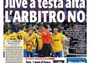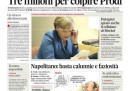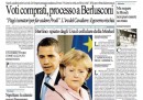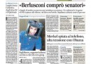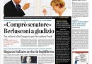 Quasi tutti i giornali oggi aprono con la notizia del rinvio a giudizio di Silvio Berlusconi da parte della Procura di Napoli per l’indagine sulla corruzione del senatore De Gregorio per far cadere il governo Prodi. Avvenire titola invece sulle accuse della Germania agli Stati Uniti per aver intercettato il cellulare di Angela Merkel, mentre il Manifesto si occupa del voto al Senato sulle riforme costituzionali nel quale il governo si è salvato per soli quattro voti per l’opposizione di parte del PDL, e il Tempo critica la scarcerazione dei fermati durante la manifestazione di sabato a Roma. I quotidiani sportivi aprono sulla sconfitta della Juventus contro il Real Madrid in Champions League, con grosse critiche all’arbitraggio.