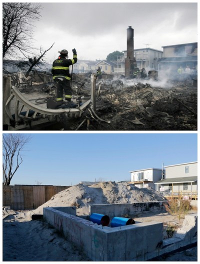 This combination of Tuesday, Oct. 30, 2012 and Monday, Oct. 21, 2013 photos shows Robert Connolly and his wife Laura as they survey the remains of the home owned by her parents that burned to the ground during Superstorm Sandy in the Breezy Point section of New York and new homes, center and right, under construction in the seaside community. (AP Photo/Mark Lennihan)