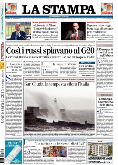 I giornali di oggi aprono con notizie diverse: molti si occupano della situazione politica italiana, con l’attacco di Beppe Grillo al Presidente della Repubblica Napolitano, il riavvicinamento fra Berlusconi e Alfano, e l'”effetto Leopolda” su Renzi e il PD. La Stampa, il Corriere della Sera e Avvenire seguono invece le vicende di spionaggio e, dopo il caso delle intercettazioni dell’NSA, le accuse alla Russia di aver spiato i partecipanti al G20 di San Pietroburgo, mentre Repubblica, il Sole 24 Ore e il Messaggero aprono sulle possibili modifiche alle imposte sulle abitazioni.