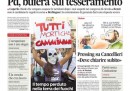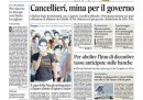 Le polemiche sul Ministro della Giustizia Cancellieri per il suo intervento per richiedere la scarcerazione di Giulia Ligresti sono in apertura su quasi tutti i giornali di oggi: le notizie di ieri sono la richiesta di chiarimenti da parte del PD e la mozione di sfiducia presentata dal Movimento 5 Stelle. Le eccezioni sono l’Unità, che titola sulle polemiche precongressuali sul tesseramento nel PD, il Manifesto, che titola sulla “terra dei fuochi” tra Napoli e Caserta, e i quotidiani sportivi, che presentano gli anticipi di oggi del campionato di serie A.