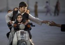 An Afghan man with his five children on his motorbike pays money to enter a park in Kandahar, southern Afghanistan, Friday, Nov 1, 2013. On Fridays, a day of weekly prayers, children and their families traditionally gather in one of the few parks. (AP Photo/Anja Niedringhaus)