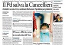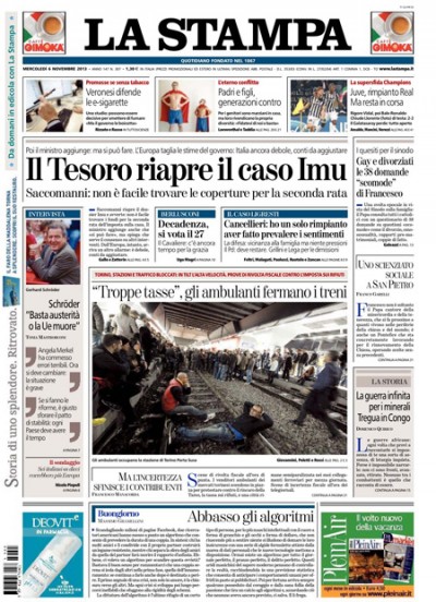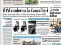 Sono due le notizie che si dividono l’apertura sui giornali di oggi: la fiducia confermata dai partiti che sostengono il governo al Ministro della Giustizia Cancellieri, dopo il suo intervento di ieri in Parlamento per spiegare l’intervento in favore di Giulia Ligresti, e le parole del Ministro dell’Economia Saccomanni, che ha dichiarato che è difficile trovare le coperture per la cancellazione della seconda rata dell’IMU senza ulteriori interventi sui conti dello Stato. I quotidiani sportivi aprono sul pareggio fra Juventus e Real Madrid, che lascia la Juventus ancora in corsa per la qualificazione agli ottavi di Champions League.