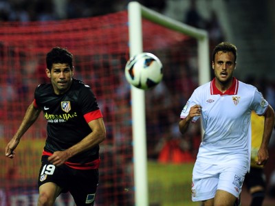 Atletico Madrid’s Brazilian forward Diego da Silva Costa celebrates after scoring against Sevilla during the Spanish league football match Sevilla FC vs Club Atletico de Madrid at the Ramon Sanchez Pizjuan stadium in Sevilla on August 18, 2013. AFP PHOTO / CRISTINA QUICLER (Photo credit should read CRISTINA QUICLER/AFP/Getty Images)