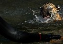 I lorichetti arcobaleno sono decisamente gli animali più colorati tra quelli che valeva la pena fotografare questa settimana, ma è notevole anche il contrasto tra le piume bianche e gli occhi gialli della civetta delle nevi. Ci sono poi elefanti che giocano con le proboscidi, orsi polari che giocano con morsi e abbracci, una femmina di gorilla di pianura occidentale che culla il suo piccolo nato da pochi giorni e una tigre di Sumatra che deve superare la “prova di nuoto” nello zoo di Washington DC.