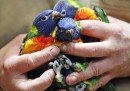 Zoo keeper Alexander Nolte holds three two months old rainbow parrots or loris at the zoo in Duisburg, Germany, Friday, Nov. 8, 2013. These colorful species usually lives in Australia and gets up to 30cm (1ft) tall. Duisburg is one of the big breeding places in Europe. The parrots were taken out to ring their feet for easier identifying. (AP Photo/Frank Augstein)