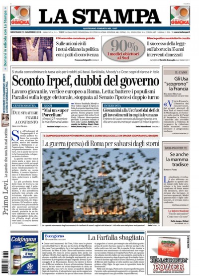 Oggi i giornali si occupano di notizie diverse in apertura: molti seguono ancora l’esame degli emendamenti e delle possibili modifiche alla legge di stabilità, il Corriere della Sera e il Manifesto aprono invece sulle conclusioni del plenum del partito comunista cinese per rilanciare la crescita economica del paese, la Repubblica titola sulla legge elettorale, per la quale ancora non si vede una possibile soluzione condivisa, l’Unità si occupa dei dati sulla disoccupazione giovanile in Europa, e il Giornale apre sulle polemiche per le parole di una deputata del Movimento 5 Stelle che ha ricordato fra le vittime dell’attentato di Nassiriya anche l’attentatore.