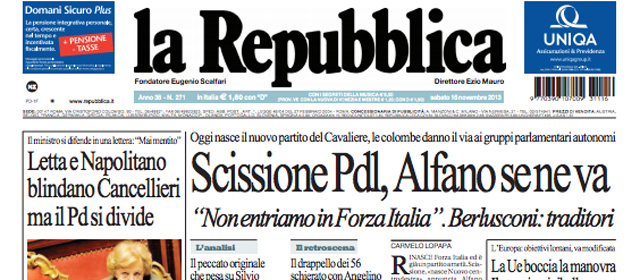 Per quasi tutti i giornali di oggi l’apertura è dedicata alla scissione nel PDL, con il fallimento dell’ultimo tentativo di mediazione fra falchi e colombe e la decisione del gruppo guidato da Alfano di non partecipare al consiglio nazionale di oggi che sancirà il ritorno di Forza Italia e di formare gruppi autonomi in Parlamento. Il Sole 24 Ore e Avvenire titolano invece sulla bocciatura della legge di stabilità da parte dell’Unione Europea, preoccupata per la mancata riduzione del debito pubblico, mentre il Manifesto e il Mattino si occupano della questione dei rifiuti nella “terra dei fuochi”.