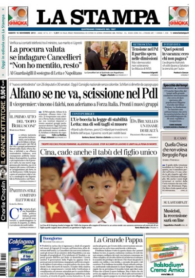 Per quasi tutti i giornali di oggi l’apertura è dedicata alla scissione nel PDL, con il fallimento dell’ultimo tentativo di mediazione fra falchi e colombe e la decisione del gruppo guidato da Alfano di non partecipare al consiglio nazionale di oggi che sancirà il ritorno di Forza Italia e di formare gruppi autonomi in Parlamento. Il Sole 24 Ore e Avvenire titolano invece sulla bocciatura della legge di stabilità da parte dell’Unione Europea, preoccupata per la mancata riduzione del debito pubblico, mentre il Manifesto e il Mattino si occupano della questione dei rifiuti nella “terra dei fuochi”.