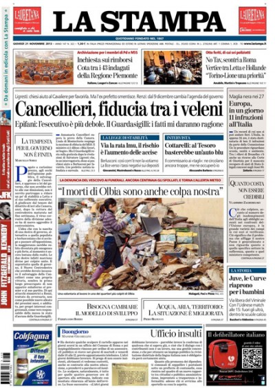 La maggior parte dei giornali di oggi apre con le notizie sul Ministro della Giustizia Cancellieri, che supera il voto sulla mozione di sfiducia presentata dal Movimento 5 Stelle nonostante le tensioni all’interno del PD mentre escono nuove accuse sui suoi rapporti con Ligresti dai verbali dell’interrogatorio di Salvatore Ligresti. Il Corriere della Sera e il Manifesto si occupano invece dell’alluvione in Sardegna, con i primi funerali delle vittime e l’analisi delle cause e delle responsabilità, mentre il Messaggero e Avvenire titolano sugli scontri di Roma fra polizia e no-TAV e sul vertice Italia-Francia che ha confermato l’impegno per la realizzazione dell’alta velocità.