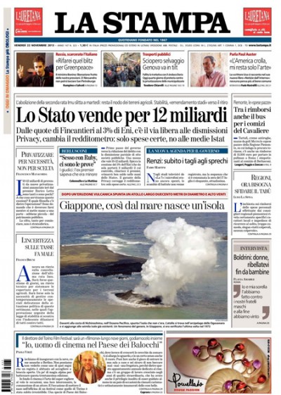 La maggior parte dei giornali di oggi apre con le notizie economiche: l’annuncio da parte del Presidente del Consiglio Letta e del Ministro dell’Economia Saccomanni di un piano di privatizzazioni di otto società pubbliche (fra le quali anche Eni e Fincantieri), che dovrebbe garantire al governo un entrata di dodici miliardi, e il nuovo rinvio della decisione sull’abolizione della seconda rata dell’IMU, mentre il Messaggero titola sulla decisione del garante della privacy, che ha imposto dei limiti all’utilizzazione del redditometro. Repubblica si occupa invece delle motivazioni depositate ieri della sentenza per il processo Ruby.
