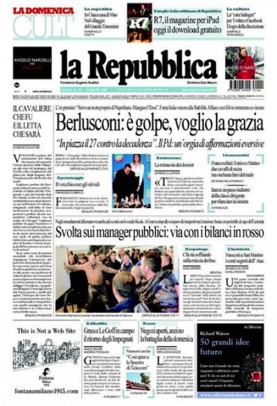 Le prime pagine di oggi si dividono tra due temi principali, uno politico e uno economico. Repubblica titola “Berlusconi: è golpe, voglio la grazia”, a proposito di alcune dichiarazioni fatte ieri dall’ex premier a un incontro con i giovani del partito (il “golpe” è riferito alla questione della sua decadenza da senatore, per cui si voterà il 27 novembre). Il Corriere della Sera e la Stampa dedicano il titolo di prima pagina, invece, alle anticipazioni sulle prossime misure per la riduzione del cuneo fiscale, che sono contenute nella legge di stabilità in via di approvazione. I quotidiani sportivi si occupano invece dei cattivi risultati in campionato del Milan (che ha pareggiato 1-1 in casa col Genoa) e del Napoli (che ha perso 0-1 contro il Parma).