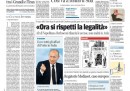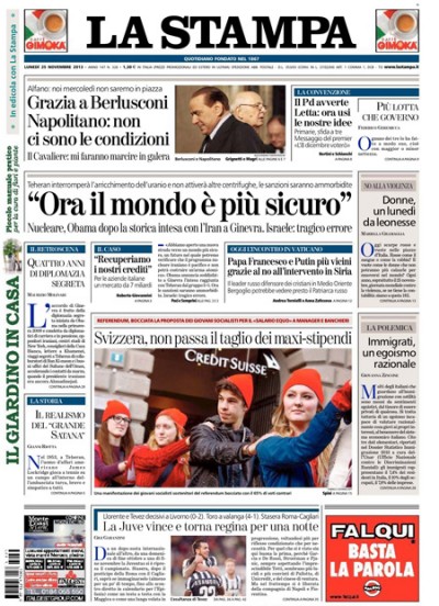 Tutti i giornali di oggi aprono con le parole di Napolitano che, rispondendo all’intervento di sabato di Silvio Berlusconi, ha dichiarato che non ci sono i presupposti per la concessione della grazia su iniziativa della Presidenza della Repubblica, ma l’altra notizia che ha un gran rilievo sulle prime pagine è l’accordo raggiunto a Ginevra sul nucleare con l’Iran, che potrà continuare le ricerche ma solo per un uso pacifico. I quotidiani sportivi titolano con la vittoria della Juventus, che è sola in testa alla classifica in attesa della partita di stasera fra Roma e Cagliari.