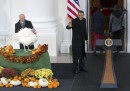 Come l’anno scorso la Casa Bianca ha deciso di aprire un sondaggio online per decidere quale tra i due tacchini – si chiamano Caramel e Popcorn, vengono dal Minnesota, hanno entrambi due settimane e pesano circa 17 chili l’uno – graziare e nominare Tacchino Nazionale del Ringraziamento. Ha vinto Popcorn. Barack Obama, accompagnato dalle figlie Malia, di 15 anni, e Sasha, di 12, ha detto che «la gara era dura, ma posso dichiarare ufficialmente che il vincitore è Popcorn, il che dimostra che persino un tacchino con un nome buffo può fare strada in politica. Per quel che riguarda Caramel, resta nei paraggi, e sta già raccogliendo soldi per la prossima campagna». Poi, davanti sul Portico nord della Casa Bianca, ha graziato il tacchino dicendo: «Con il potere concessomi, garantisco a Popcorn la grazia piena da un futuro di ripieno e salsa ai mirtilli».