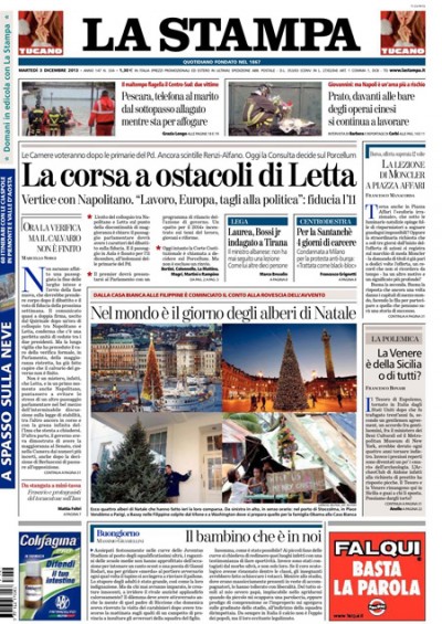 Oggi i giornali dedicano l’apertura a notizie diverse: molti titolano sull’incontro fra il Presidente della Repubblica Napolitano e il Presidente del Consiglio Letta, e sulla decisione del governo di presentarsi alle Camere per ottenere un voto di fiducia dalla nuova maggioranza che lo sostiene l’11 dicembre, l’Unità, Avvenire e il Messaggero seguono invece le indagini sull’incendio di Prato, il Messaggero e il Secolo XIX si occupano delle possibili modifiche all’IMU per esentare i redditi più bassi dal pagamento della quota aggiuntiva, Repubblica apre con un’intervista al commissario europeo Rehn che chiede all’Italia un’azione più decisa per la riduzione del debito pubblico, mentre Libero chiede le dimissioni del Ministro dell’Economia Saccomanni.